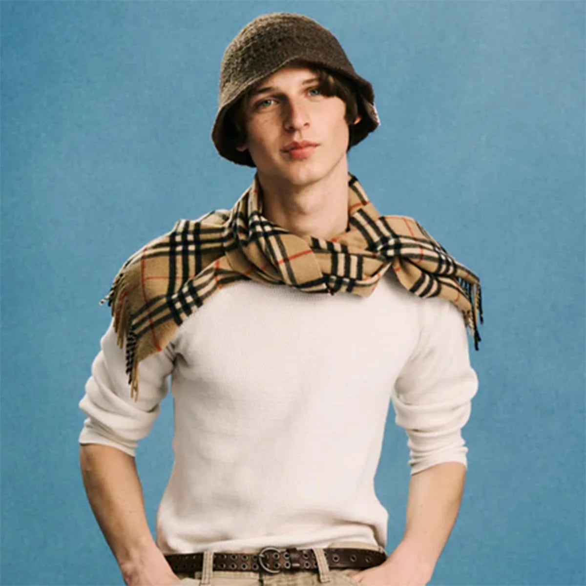 ローゲージで編まれたブリムがついたハット型ニット帽、通称クロシェハット。