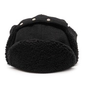 当時は完全に防寒用として作られていた飛行帽ですが、ブリムとシコロのボアがアクセントになりファッションとしても合わせられる帽子です。表地はハリスツイードを使い、裏地は防寒製に優れたミリタリーライニングを入れ周りにウール混ボアを使っています。フロントのブリムは当時使われていた4つ割れボタンを使用し、取り外した際にブリムが下がり前後逆に被れば首を温めることができる仕様になります。